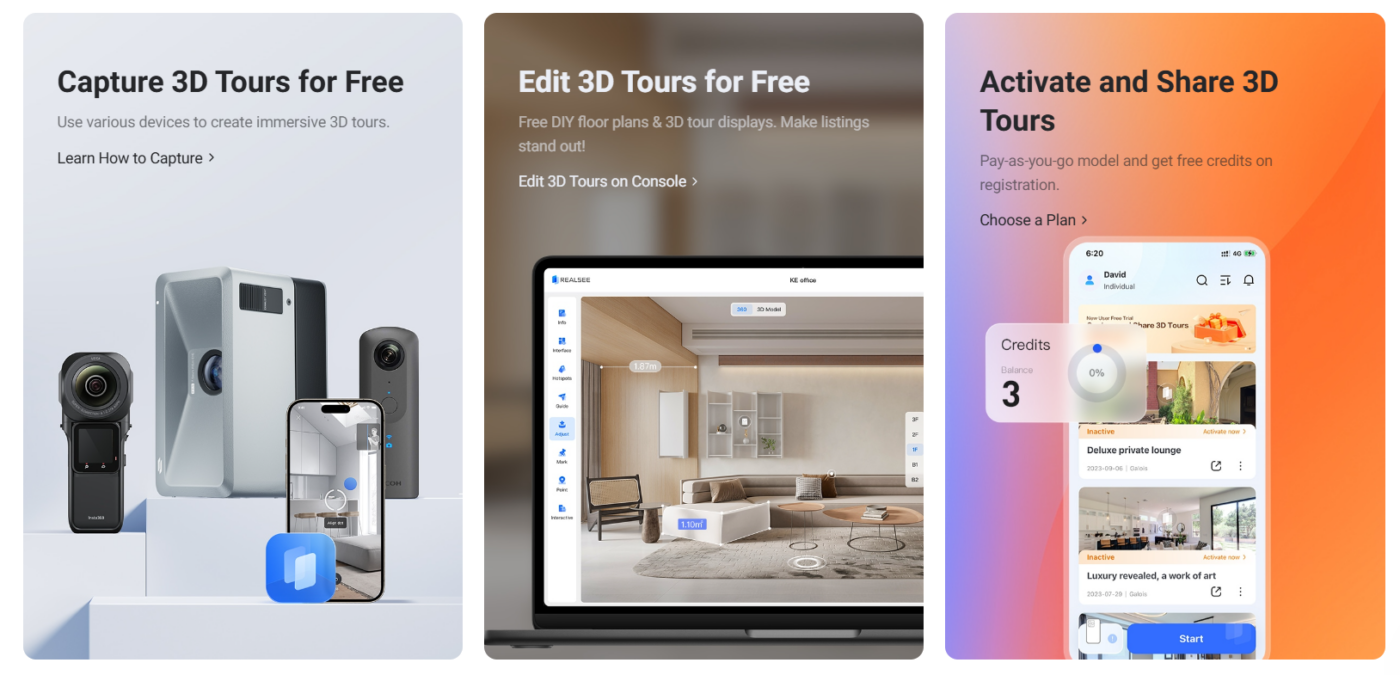 No monthly fees! Capture, upload, and edit 3D tours for free. New users receive credits to explore full 3D tour creation & sharing process at no cost!